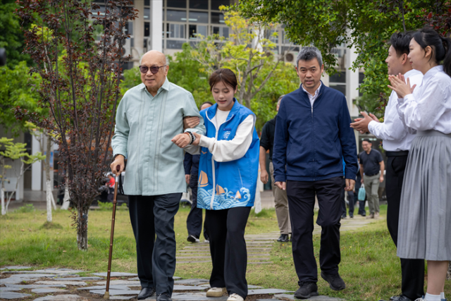 “欢迎立人先生回家”,在师生热烈的掌声、亲切的欢迎中,陈立人老先生激动地说“真的回家了”。他参观了嘉庚长廊,认真地读着每一句“眉头警语”,他指着“诚以待人,毅以处事”说,这些训诫看似简单,却道透了做人做事的道理。走过复兴长廊,老先生更是感慨:“祖父临终时,最放不下的就是实现中华民族伟大复兴,这个复兴长廊建得好”。在《嘉庚讲学》铜雕群像旁,陈立人老先生为嘉庚铜像敬献鲜花,并现场观看了学生表演的《嘉庚颂歌》。在校史馆参观中,陈立人先生偶遇了正在校史馆进行《陈嘉庚与陈嘉庚精神》课程的现场教学的学生。他亲切地接过学生们手中的书,郑重地签上了自己的名字。还转身对陪同他参访的儿子说,你也签个名字吧。