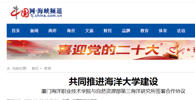 中国网福建讯11月18日上午,厦门海洋职业技术学院与自然资源部第三海洋研究所(以下简称“海洋三所”)签署合作协议,共同推进高水平职业教育类型海洋大学建设。福建省教育厅副厅长吴伟平、厦门市教育局局长陈珍、自然资源部第三海洋研究所所长蔡锋,学院党委书记陈一端、院长陈昌萍出席签约仪式。