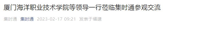 2023年2月15日,厦门海洋职业技术学院党委书记陈一端、校长陈昌萍、党委副书记缪雄平和海职院校友等领导一行莅临集时通交流指导,并向厦门海职院校友介绍了学校建设发展和升本工作的进展情况。我司董事长苏建顺、CTO林辉、产业合作部总经理高灿炜等陪同各位领导来宾参观了我司展示厅,向来宾演示了公司智慧校园和智慧交通软硬件产品、云原生数字化底座、物联网中台、数据中台、校园综合运营态势大屏等技术成果。