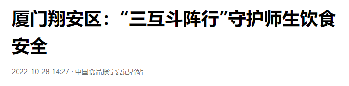 此外,该所还组织成立专项检查组,各组由市场监管所执法人员1名、网格员2名、各学校食品安全总监1名、各学校食品安全管理员1名、各食堂负责人1名、各被检学校师生自愿者代表1名组成。各检查组采取“交叉检查”模式,对各学校进行检查评分,评分排名前三的学校进行通报表扬,后三名进行约谈、监督整改。经检查,厦门海洋学院一楼京元餐厅综合排名第一,被评为典范食堂,市场监管部门拟组织翔安文教园园区各食堂对其进行参观学习,以共同提高。