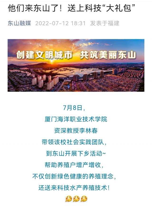 7月8日,全国优秀教师、知名水产养殖专家、厦门海洋职业技术学院资深教授李林春和该校海洋生物学院党总支部书记王斌,带领该校大学生暑期“三下乡”“海洋来信”团队,到东山县进行为期4天的社会实践活动,把科技送到东山县的池塘海边,助力乡村振兴。