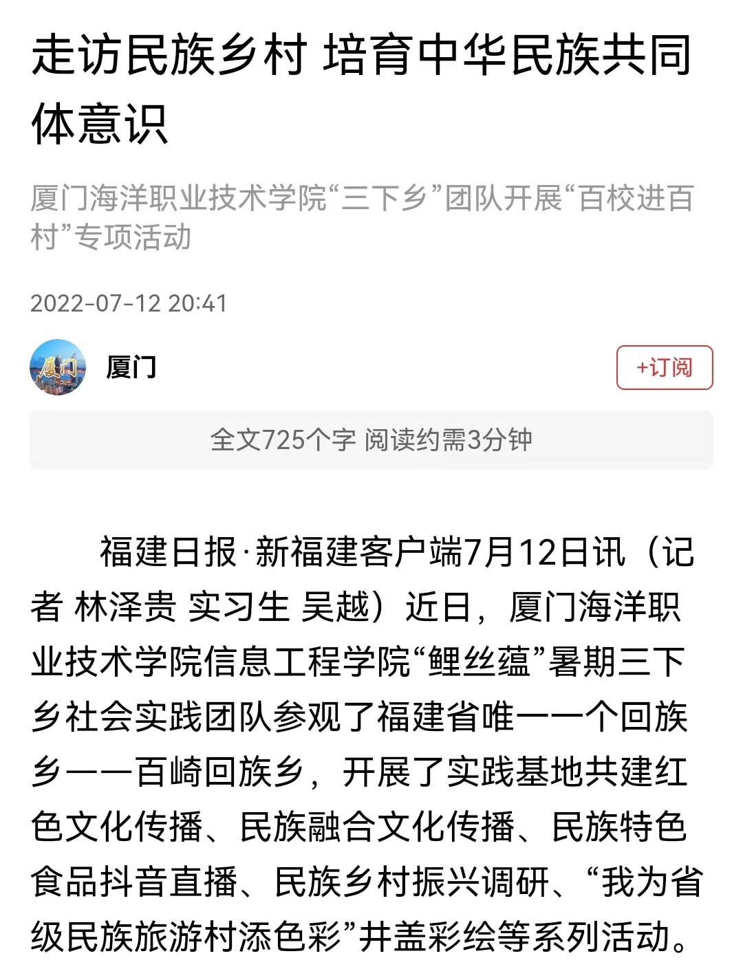 福建日报新福建客户端7月12日讯(记者 林泽贵实习生吴越)近日,厦门海洋职业技术学院信息工程学院“鲤丝蕴”暑期三下乡社会实践团队参观了福建省唯一一个回族乡——百崎回族乡,开展了实践基地共建红色文化传播、民族融合文化传播、民族特色食品抖音直播、民族乡村振兴调研、“我为省级民族旅游村添色彩”井盖彩绘等系列活动。