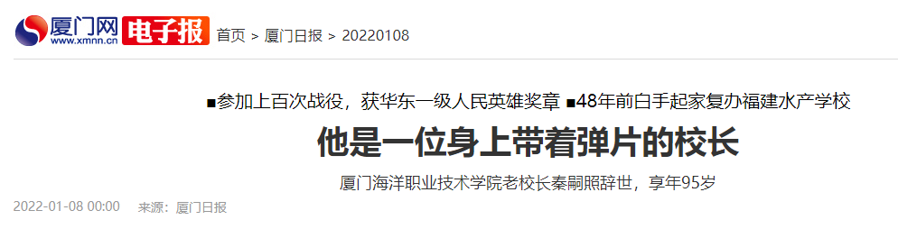 秦嗣照1月3日在厦门辞世,享年95岁。48年前,他白手起家复办福建水产学校,即现在厦门海洋职业技术学院前身。