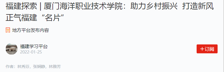 为响应打造新风正气福建“名片”活动的号召,厦门海洋职业技术学院服务国家扶贫攻坚、乡村振兴战略,大力开展现代渔业、绿色渔业、智慧渔业人才培养及技术攻关,发挥高等职业教育在乡村振兴中应有的担当。学校坚持“服务海洋、服务地方”的办学定位,以海洋相关产业和区域经济对技术技能型人才的需求为导向,构建包含学历提升、职业培训和技术服务等为一体的社会服务平台,并建立校地联动、协同推进的工作机制,扎实开展教育助力乡村振兴工作,为脱贫攻坚和乡村振兴提供人才和技术支持。
