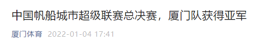 2021年12月29日-2022年1月1日,中国帆船城市超级联赛总决赛在无锡举行,厦门海洋学院帆船队代表厦门市参赛,以预赛成绩第一名进入半决赛,在半决赛中表现出色,以2:0战胜衢州队进入冠亚军争夺战,最终夺得亚军。
