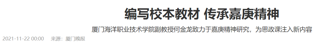 今年9月,一门全新的校本文化必修课《陈嘉庚与陈嘉庚精神》在厦门海洋职业技术学院推出,面向全校四千名新生介绍嘉庚精神的核心内涵和陈嘉庚的生平事迹。该门课推出后广受好评,而该课配套教材《陈嘉庚与陈嘉庚精神》的作者,正是厦门海洋职业技术学院马克思主义学院副教授何金龙。
