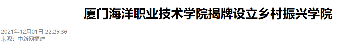 校方称,成立乡村振兴学院,是进一步服务国家乡村振兴战略的重要举措,是加快落实福建省委、厦门市委“筹建海洋职业大学”的具体行动。学院将主动加强校地合作,聚焦实施乡村振兴战略急需紧缺的各类实用人才,因地制宜设计社会培训等项目,积极探索高层次职业教育服务乡村振兴的新途径、新机制,在新时代乡村振兴中探索“厦门方案”、贡献“厦门智慧”。