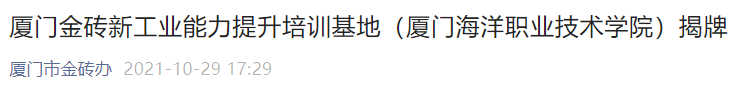 继厦门城市职业学院、厦门技师学院举行厦门金砖新工业能力提升培训基地揭牌仪式后,10月29日上午,作为厦门金砖新工业能力提升培训基地联盟首批授牌成员单位,厦门海洋职业技术学院举行培训基地揭牌仪式。市金砖办常务副主任黄峰、副主任李铭,厦门海洋职业技术学院党委书记陈一端、副校长孙学耕出席仪式,共同为培训基地揭牌。