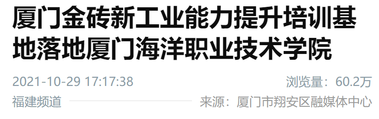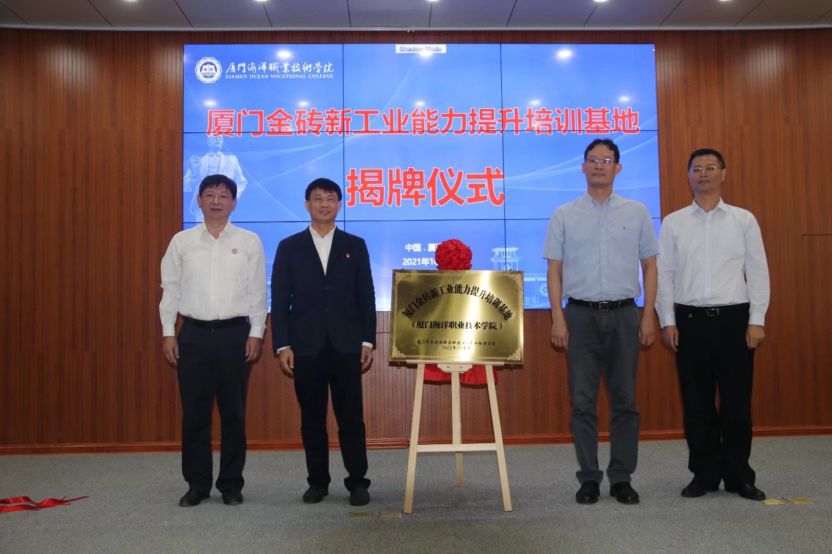 日前,金砖创新基地举行“厦门金砖新工业能力提升培训基地联盟”授牌仪式,厦门海洋职业技术学院成为首批获授牌成员单位之一。10月29日,学校举办“厦门金砖新工业能力提升培训基地”(以下简称“培训基地”)揭牌仪式,厦门市金砖创新基地建设领导小组办公室常务副主任黄峰、副主任李铭、厦门海洋职业技术学院党委书记陈一端出席仪式并为培训基地揭牌。