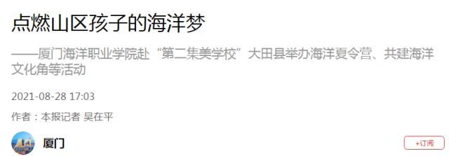 山海相约实践队是厦门海洋职业技术学院暑期“三下乡”社会实践活动打造的重点团队,从去年创立开始,就围绕海洋特色,已经连续为华安、大田两个县建设了海洋知识角。厦门海洋职业技术学院宣传部部长林秀芬表示,希望通过每一年每一届持续不断的努力,能够培养出一批怀抱海洋强国梦,勇敢走向全世界的新时代青少年。