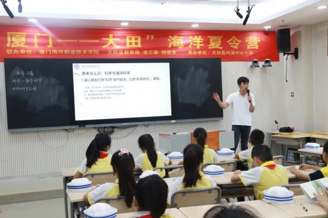 “大家好,我叫乐见烜,我长大后想当一名船长,开着大轮船插着五星红旗,环游世界。”“大家好,我叫温雅冰,我长大后想当一名海军,穿着白色的军装,英姿飒爽,建设海洋强国。”在福建省三明市大田县均溪中心小学,80名拿到海洋夏令营结营证书的六年级小学生正在自豪地跟同伴分享自己的海洋梦想。连日来,厦门海洋职业技术学院暑期“三下乡”山海相约实践队的师生们在这里举办了“厦门-大田”海洋夏令营。