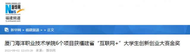 新华网厦门8月2日电(记者 付敏)记者从厦门海洋职业技术学院获悉,在日前落幕的第七届福建省“互联网+”大学生创新创业大赛职教赛道中,该校6个项目捧得金奖。