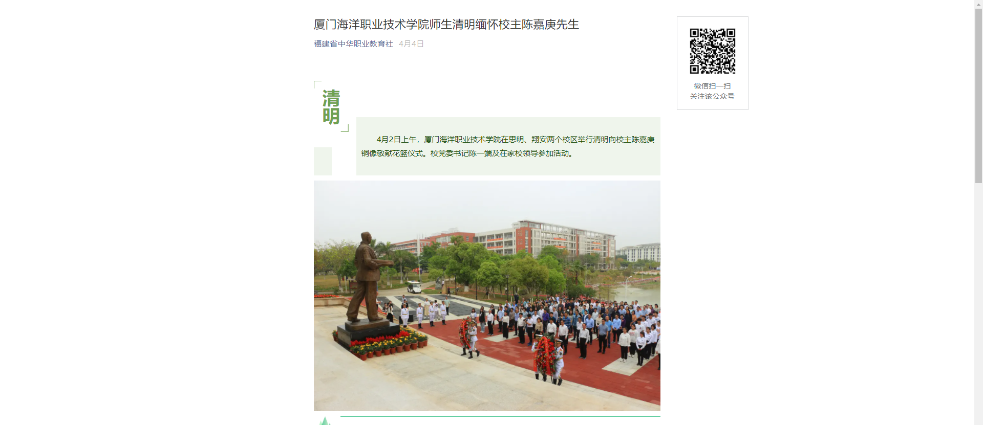 4月2日上午,厦门海洋职业技术学院在思明、翔安两个校区举行清明向校主陈嘉庚铜像敬献花篮仪式。校党委书记陈一端及在家校领导参加活动。