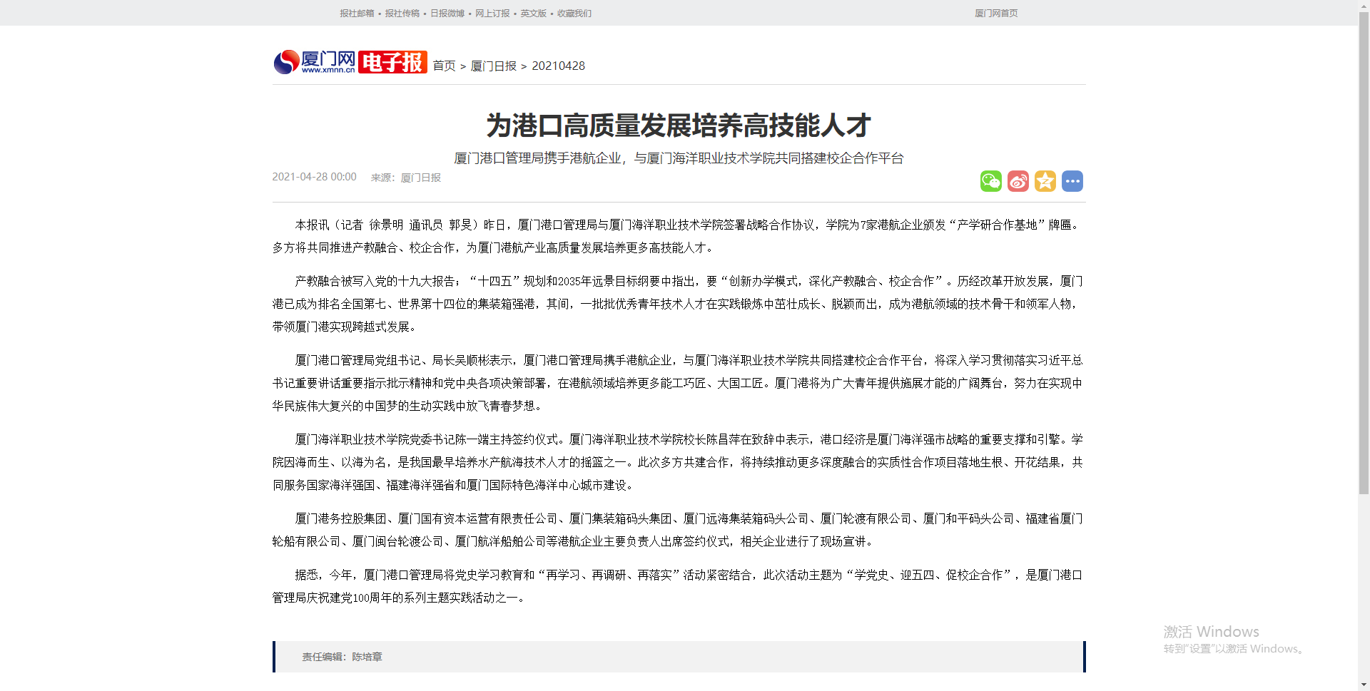 厦门港口管理局党组书记、局长吴顺彬表示,厦门港口管理局携手港航企业,与厦门海洋职业技术学院共同搭建校企合作平台,将深入学习贯彻落实习近平总书记重要讲话重要指示批示精神和党中央各项决策部署,在港航领域培养更多能工巧匠、大国工匠。厦门港将为广大青年提供施展才能的广阔舞台,努力在实现中华民族伟大复兴的中国梦的生动实践中放飞青春梦想。