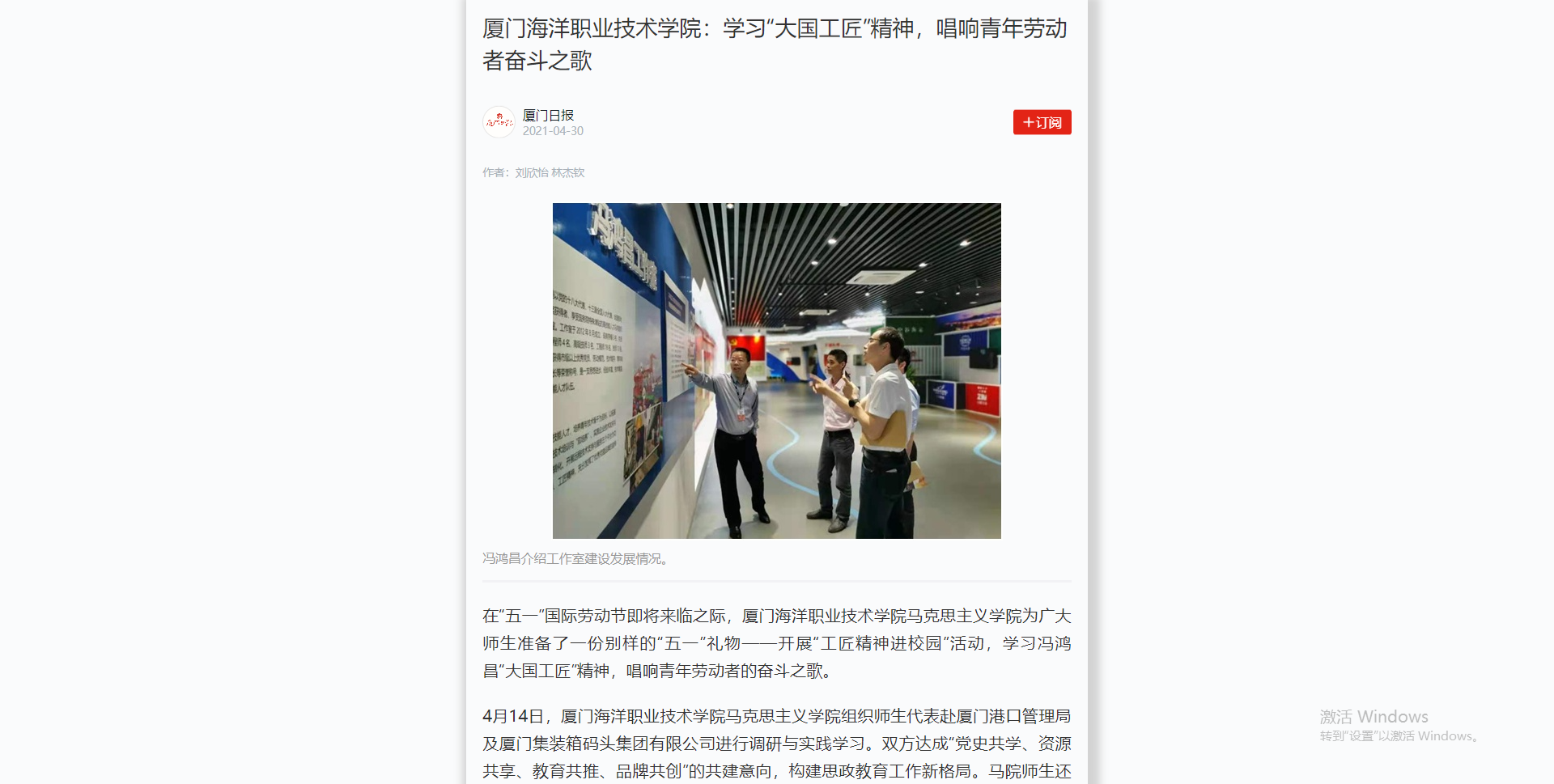 在“五一”国际劳动节即将来临之际,厦门海洋职业技术学院马克思主义学院为广大师生准备了一份别样的“五一”礼物——开展“工匠精神进校园”活动,学习冯鸿昌“大国工匠”精神,唱响青年劳动者的奋斗之歌。