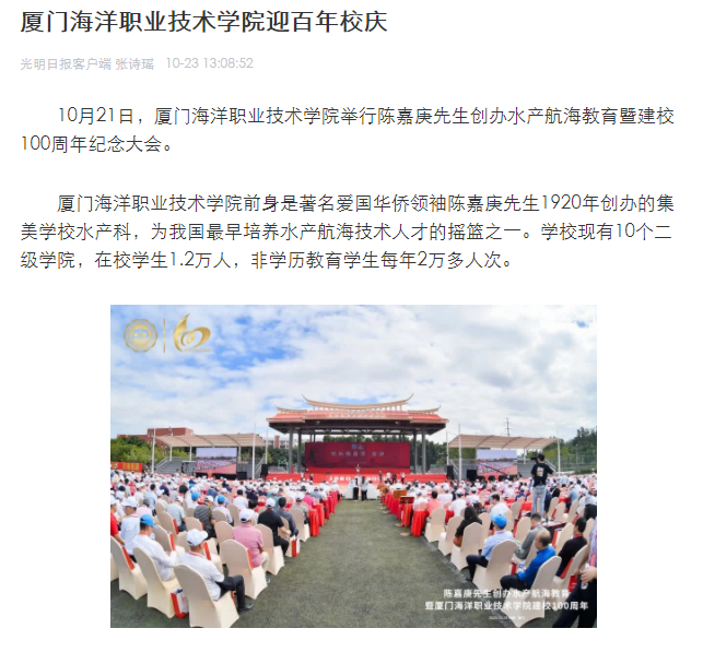 10月21日,厦门海洋职业技术学院举行陈嘉庚先生创办水产航海教育暨建校100周年纪念大会。