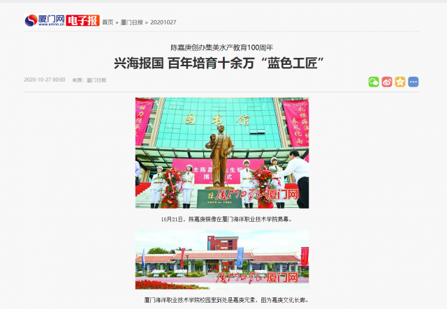 可当我们走进这所学校,所有疑惑便迎刃而解。目之所及,是陈嘉庚铜像、嘉庚文化长廊、嘉庚楼、敬贤亭,满满都是嘉庚元素——它发端于陈嘉庚1920年创办的集美学校水产科,是“嘉庚系”职业教育体系中水产这一分支的传承者。百年来,集美水产教育从集美起家,几经沧桑、几度迁徙、几易校名,“历经坎坷”最终定址翔安。