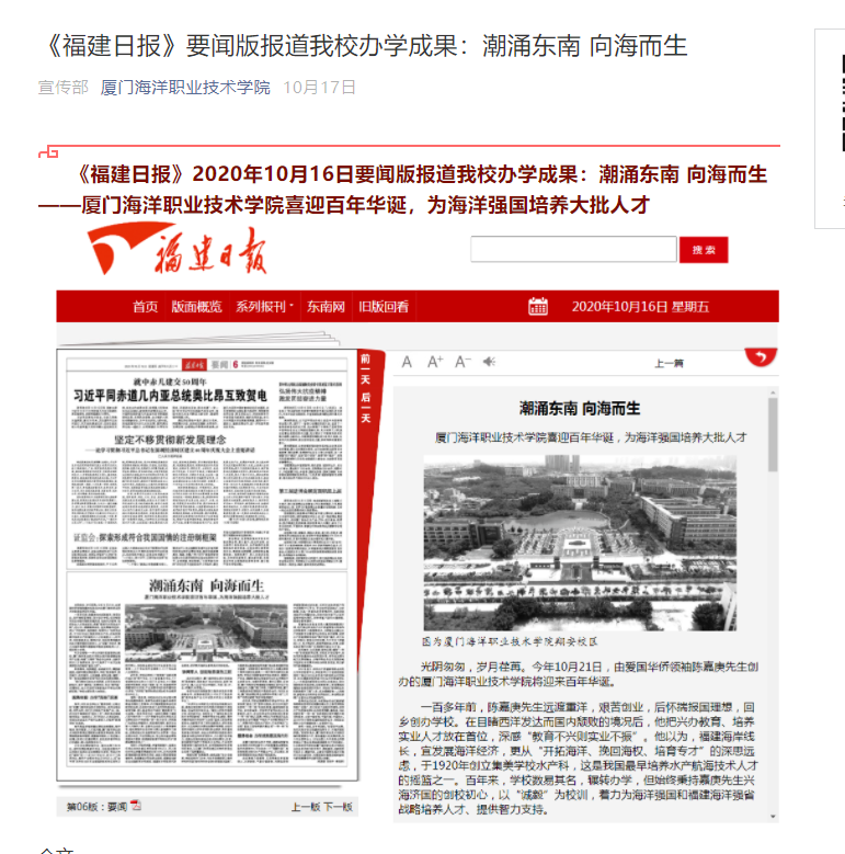 光阴匆匆,岁月荏苒。今年10月21日,由爱国华侨领袖陈嘉庚先生创办的厦门海洋职业技术学院将迎来百年华诞。