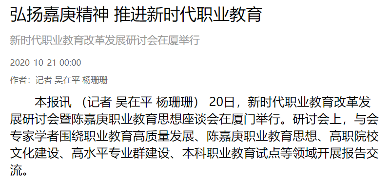 本报讯 (记者 吴在平 杨珊珊)20日,新时代职业教育改革发展研讨会暨陈嘉庚职业教育思想座谈会在厦门举行。研讨会上,与会专家学者围绕职业教育高质量发展、陈嘉庚职业教育思想、高职院校文化建设、高水平专业群建设、本科职业教育试点等领域开展报告交流。