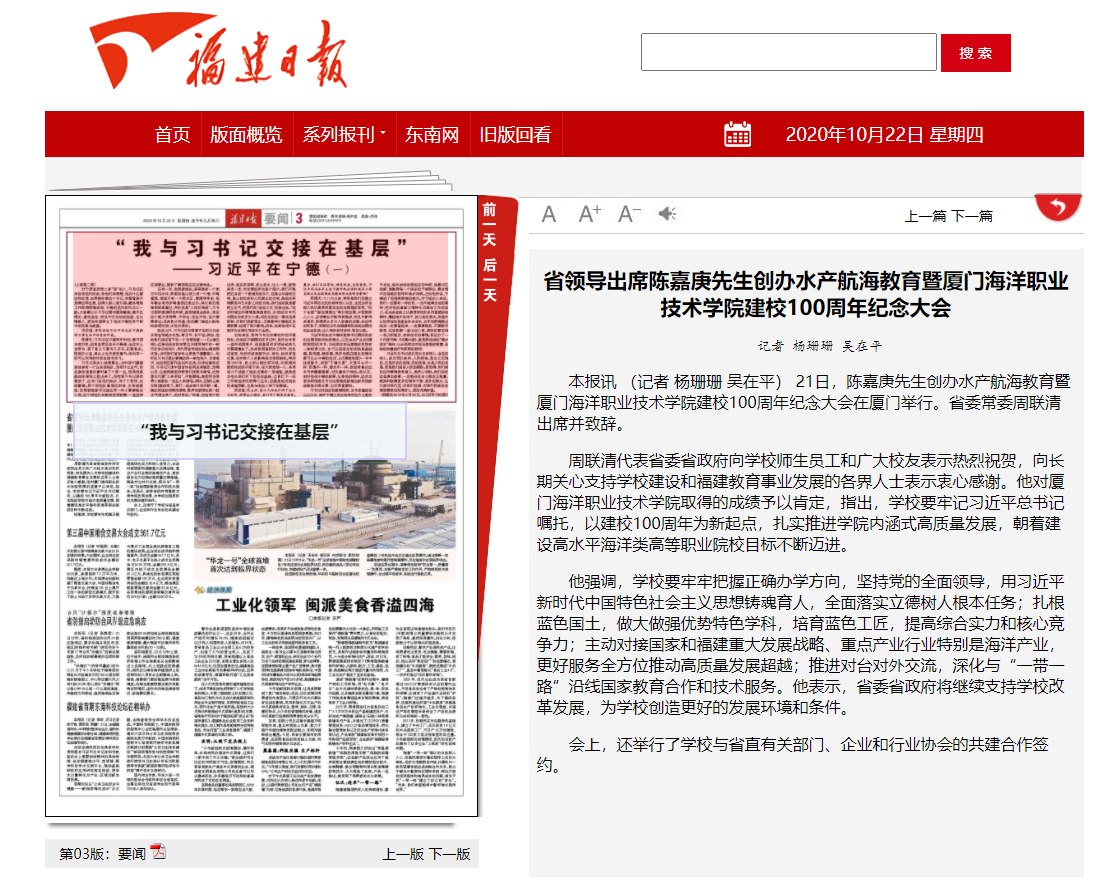 本报讯 (记者 杨珊珊 吴在平)21日,陈嘉庚先生创办水产航海教育暨厦门海洋职业技术学院建校100周年纪念大会在厦门举行。省委常委周联清出席并致辞。