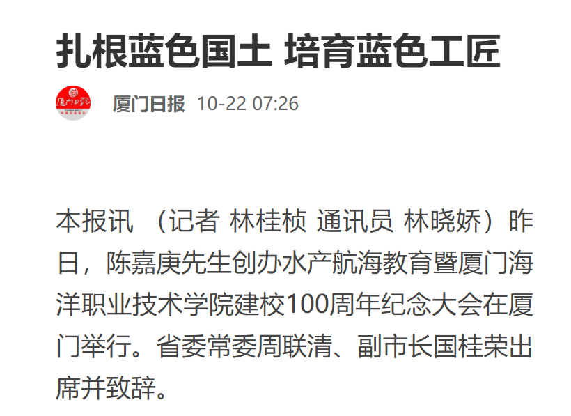 据了解,厦门海洋职业技术学院办学始于陈嘉庚先生1920年创办的集美学校水产科,百年来弘扬嘉庚精神、践行诚毅校训,为国家和福建海洋产业发展培养了大量高素质技术技能人才。