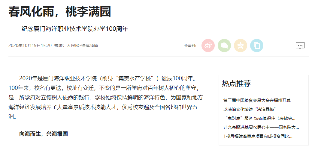 诚毅百年,薪火相传。今年10月21日,学校将迎来百年华诞。站在新的历史起点上,厦门海洋职业技术学院将秉持兴海济国初心和立德树人使命,站在更高水平、更高起点上,开启百年海院发展新征程。(厦门海洋职业技术学院马克思主义学院)