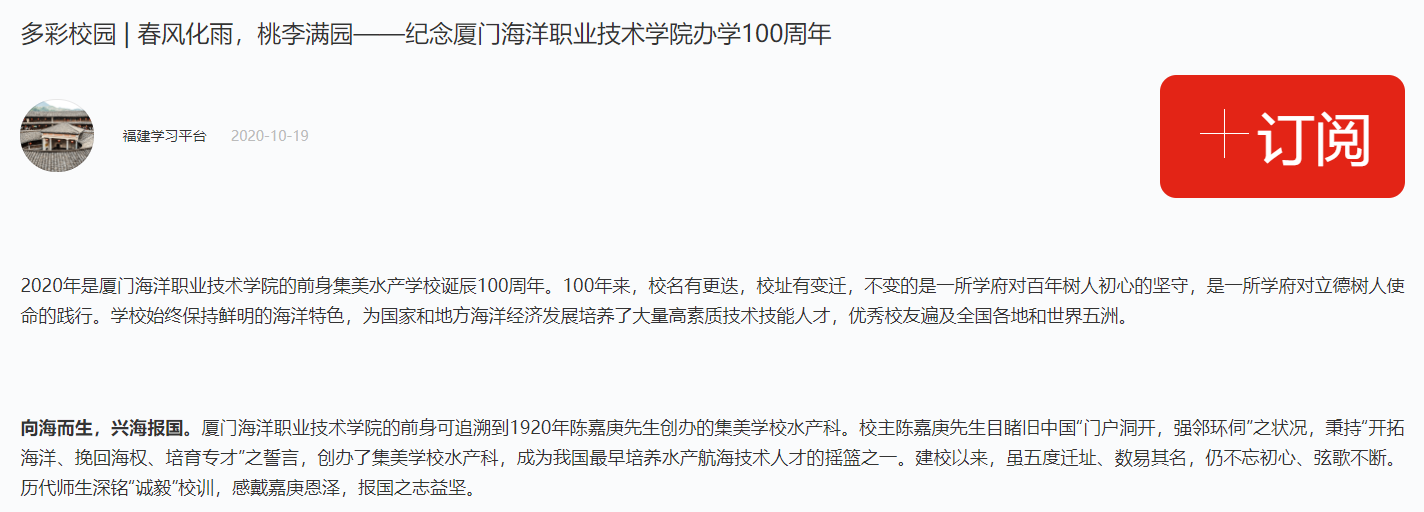 2020年是厦门海洋职业技术学院的前身集美水产学校诞辰100周年。100年来,校名有更迭,校址有变迁,不变的是一所学府对百年树人初心的坚守,是一所学府对立德树人使命的践行。学校始终保持鲜明的海洋特色,为国家和地方海洋经济发展培养了大量高素质技术技能人才,优秀校友遍及全国各地和世界五洲。