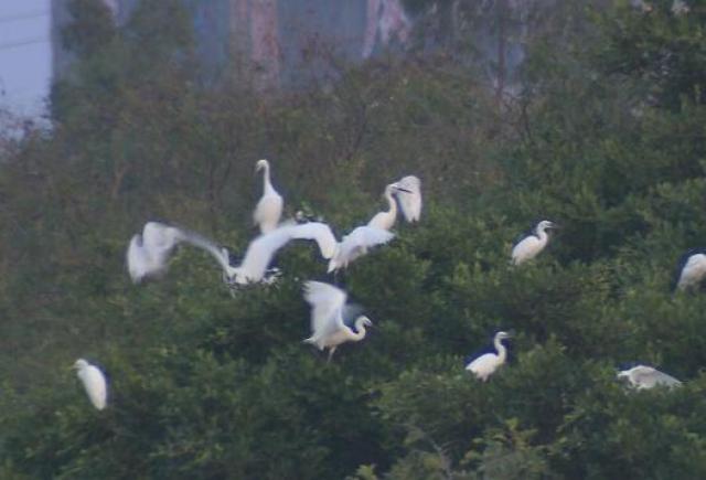 天空洒着夕阳的余晖慢慢地,从远方陆续飞来越来越多的白鹭,它们叽叽喳喳的叫声却显得傍晚更加清静,归来的白鹭们先是在空中盘旋了一会后。就纷纷停落在小山丘的树梢上,这些从天空次第降落的精灵,不一会儿,便像在这浓绿的山丘上撒上了一朵朵白茫茫的“花儿”。厦门海洋职业技术学院的陈老师告诉我们,这些白鹭大概是从去年三月份开始,陆陆续续来到这里的。