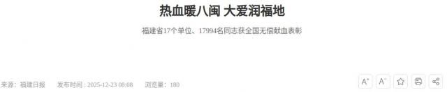 2025年12月是福建省第三个无偿献血宣传月,此次全国性表彰为我省宣传月活动增添了动人注脚。今年宣传月的主题是:热血暖八闽。让我们向所有获奖的“平凡英雄”致敬,感谢他们用爱心暖流滋润八闽大地。同时,也呼吁更多健康适龄群众加入这份温暖事业,用可以再生的血液拯救不可重来的生命,为健康福建、文明福建贡献源源不断的正能量。