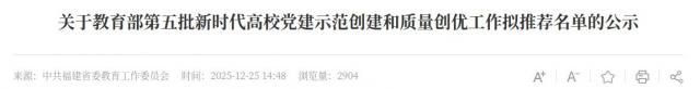 按照《教育部办公厅关于开展第五批新时代高校党建示范创建和质量创优工作的通知》(教思政厅函〔2025〕18号)要求,在高校申报基础上,经组织评审,研究确定了拟推荐名单。现将名单予以公示,公示时间:2025年12月25日至12月31日。