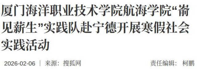 为积极响应传承发展中华优秀海洋文化的时代号召,2026年1月28日至2月3日,厦门海洋职业技术学院“嵛见薪生”实践队赴宁德嵛山岛、蕉城区及厦门市等地开展寒假社会实践活动。队员们踏海岛、访渔民、探非遗、传文化,在城乡精神文明建设与文旅产业高质量发展的探索中,用脚步丈量山海,用匠心续写文脉。