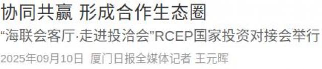 本报讯(厦门日报全媒体记者王元晖)昨天下午,“海联会客厅走进投洽会”RCEP国家投资对接会在厦门国际会展中心举行,既助力中国企业精准把握区域机遇,也为RCEP国家吸引外资提供支撑。