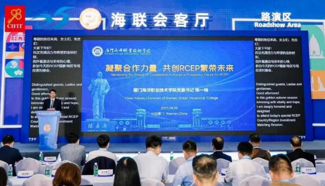 ​    ​作为本次活动的主要承办方,厦门海洋职业技术学院党委书记陈一端作致辞发言。他表示,在RCEP协定深入实施的背景下,本次对接会既是响应国家深化区域经济合作战略的具体行动,也是发挥投洽会平台优势、链接RCEP国家资源的重要举措。学校将充分发挥自身在海洋领域人才培养、校企合作、技术服务等方面优势,为推动RCEP成员国间的产业合作与人才交流提供支持,助力区域经济协同发展。