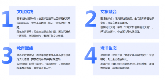 战略目标:落实区校战略合作,深化文明实践、文旅发展、教育实践、海洋生态四大板块协同。