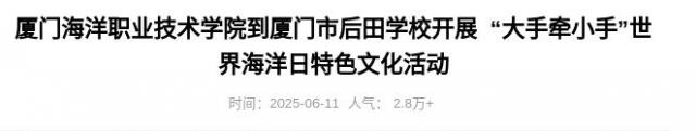 厦门海洋职业技术学院走进厦门市后田学校“大手牵小手”世界海洋日特色文化活动,是厦门海洋职业技术学院已立项的全国高校思想政治工作质量提升综合改革与精品建设项目“海洋蓝”学生身心素质训练基地实践的生动展示,是 “大中小一体化” 海洋特色文化共教共培的成果,也是“山海相约 红蓝相携”的有益尝试,为推动区域海洋蓝色文化、海防海权爱国教育发挥积极作用。