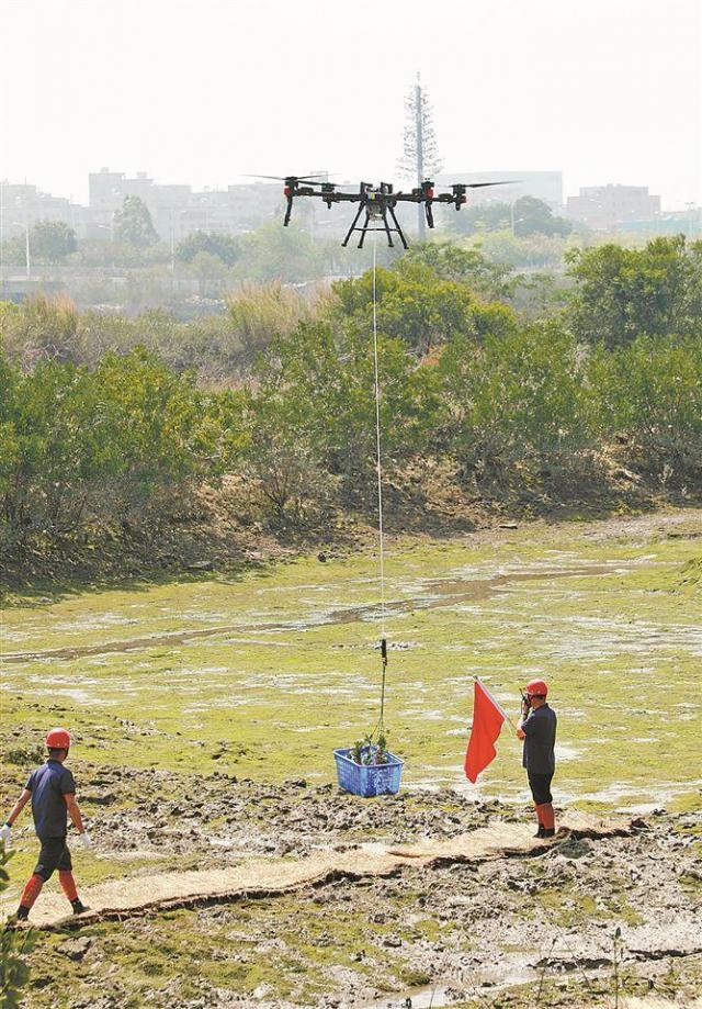 22日,该团队现场展示的无人机喷洒、无人机采样、困难地钻土、无人机运输四项技术应用,让不少人大开眼界。其中,由厦门大学开发设计的T20无人机采样设备,已实现可视化和精准定位,可快速准确采集树冠叶片,为红树林研究提供了新的采集手段。而P150无人机搭配运输系统,当天也张开有力的翅膀,将此次活动即将种植的部分苗木安全运输到滩涂上,不仅达到远距离运输的目的,还减少了过程中的苗木损耗。
