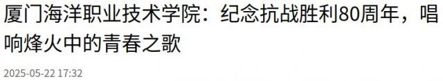 5月20日,厦门海洋职业技术学院举办了内容丰富、别开生面的“烽火中的青春之歌”主题活动,旨在纪念中国人民抗日战争暨世界反法西斯战争胜利80周年,传承爱国精神,重温红色校史,培育时代新人。