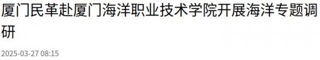 海峡导报新福建客户端3月27日讯(记者 陈金龙)3月21日,民革厦门市委宣调处一级调研员简裕卿率部分党员赴厦门海洋职业技术学院开展海洋专题调研。调研组一行受到学院热烈欢迎,学院党委书记陈一端陪同调研,民革思明基层委副主委、十二支部主委陈苏湘参加调研。