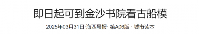 晨报讯(记者张雅雯通讯员李慧白龙骧程霞)昨日,国家艺术基金2024年度艺术人才培训资助项目“以‘船’述史:中国古船模工艺制作人才培训”作品展暨“中国古船模文化及制作工艺”学术研讨会在厦门金沙书院举行。据介绍,此次展出的作品涵盖了汉、宋、明等不同历史时期的经典船型,不仅有该项目所培养的30位工匠学员所制作完成的船模作品,还有由中国工艺美术大师团队领衔创作的一系列精品古船模作品。展览将持续至4月30日,欢迎市民朋友前往欣赏。