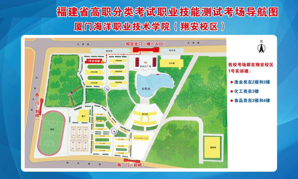 ★考生从翔安校区北门入校后,可按照校内的路线指示牌到达1号实训楼。我校考场均在1号实训楼,渔业类在2楼和3楼、化工类在3楼、食品类在2楼和4楼。