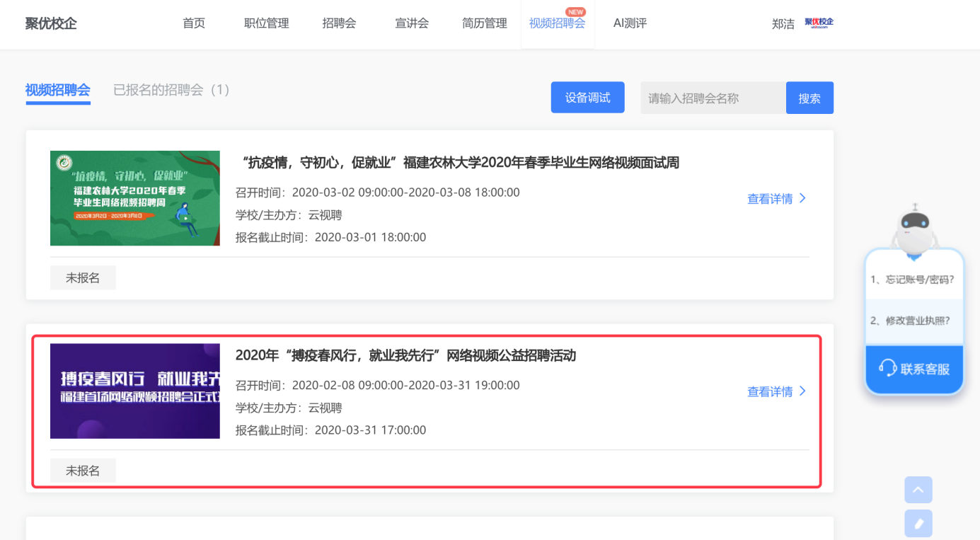 (1)点击导航栏【视聘招聘会】,进入招聘会列表。选择相应的招聘会,点击查看详情,进入招聘会详情页面。