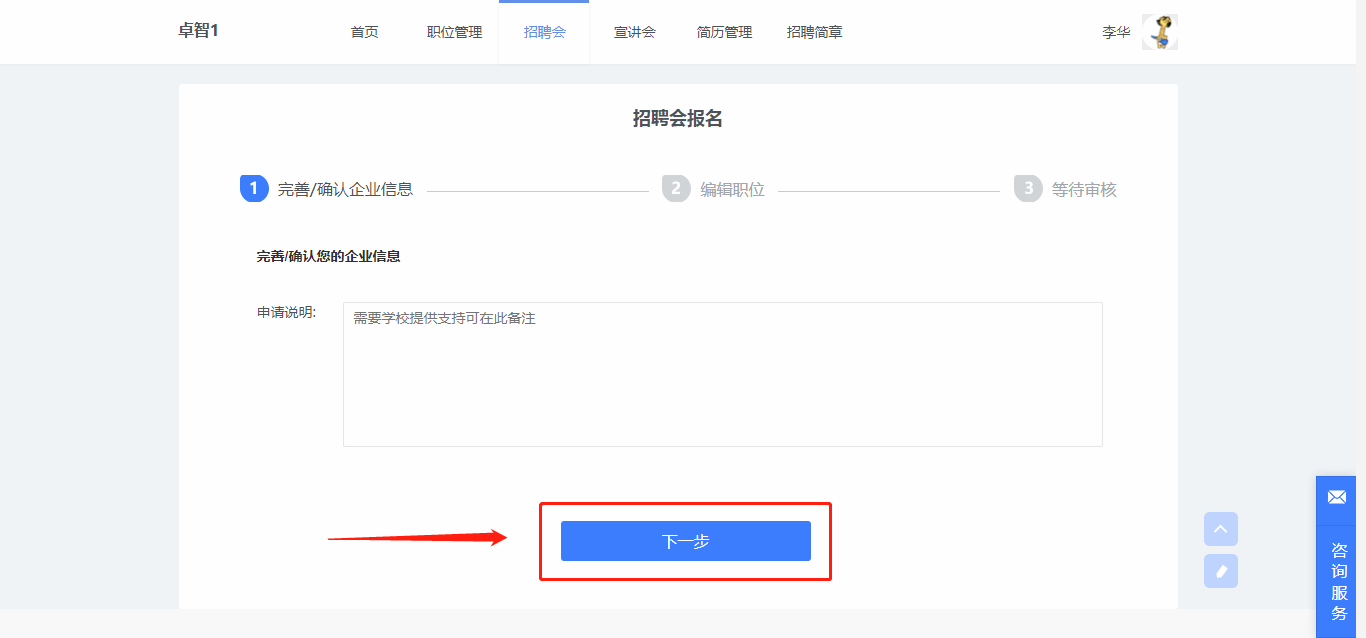 第一步可选择填写申请说明,对需要提供的支持进行备注,若无特别说明,则点击【下一步】。