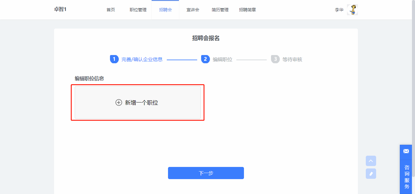 第二步编辑职位信息,职位可以新建也可以直接从已有职位中获取,编辑好职位后,可以删除职位也可以再次修改职位信息。