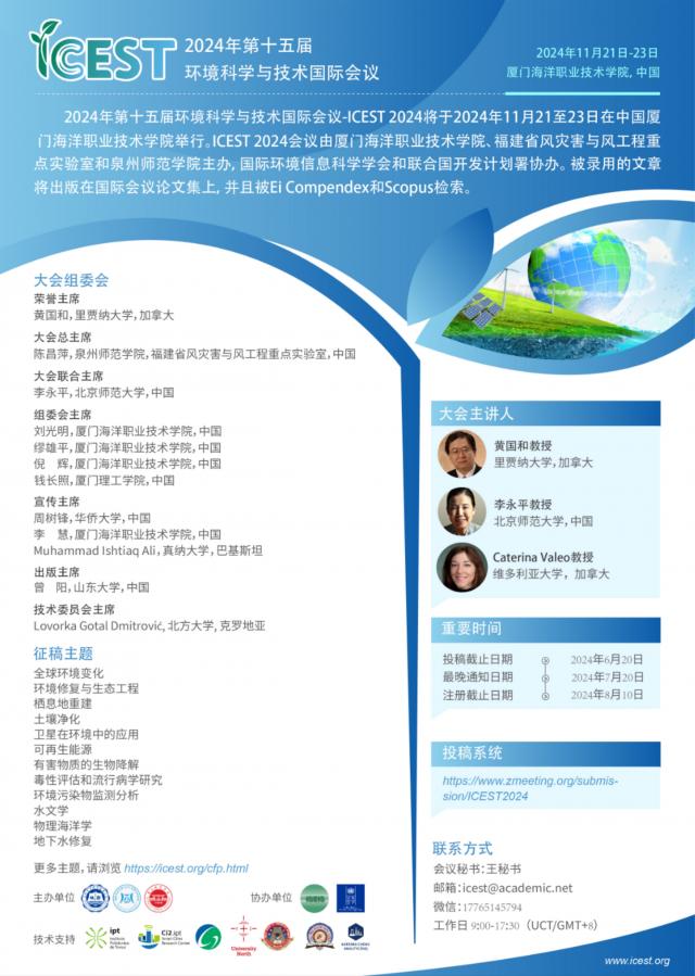 2024年第十五届环境科学与技术国际会议(ICEST 2024)将于2024年11月21日至23日在厦门举行。本次会议由厦门海洋职业技术学院、福建省风灾害与风工程重点实验室和泉州师范学院联合主办,国际环境信息科学学会和联合国开发计划署协办。