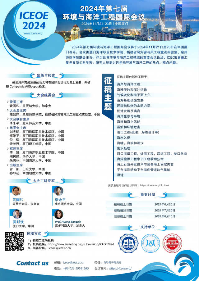 环境与海洋工程国际学术会议于2018年创办,每年举办一届,先后在台北、香港、厦门等地成功举办,历经十余届,已发展成为海洋工程领域具有权威性和国际影响力的学术会议,在业界享有较高声誉。本次会议将聚焦海岸与海洋工程、海滩侵蚀和泥沙运输、气候变化和海平面上升等海洋工程科学领域关注的前沿热点问题,继续积极促进国内外海洋工程科学领域学者之间的学术交流,分享研究经验,探寻合作机会,推动该领域科学研究的创新发展。本次会议将延续往届会议的传统,大会接收的所有文章都将被EI Compendex和Scopus等权威数据库收录检索。