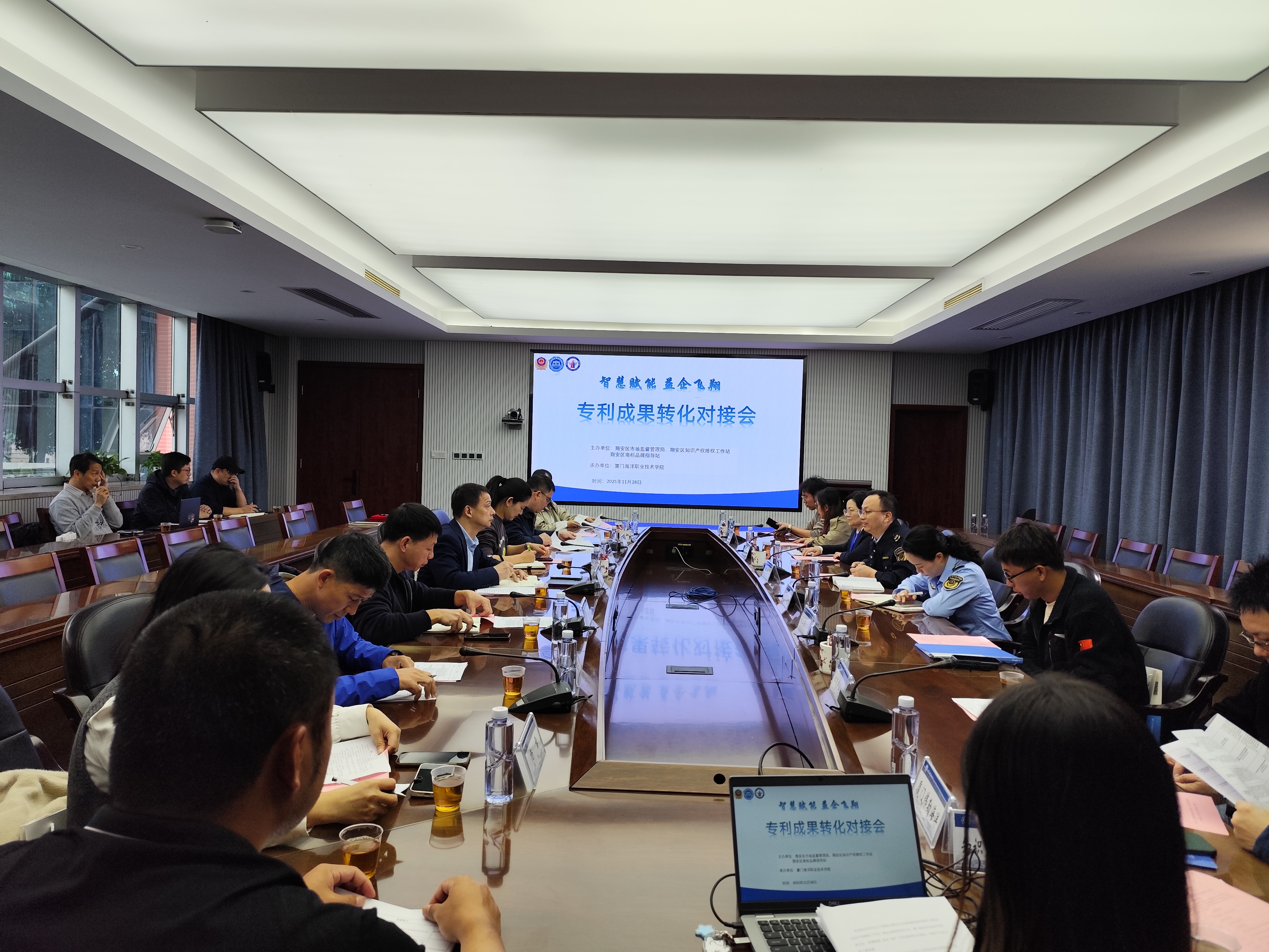 11月28日,由翔安区市场监督管理局主办、厦门海洋职业技术学院承办的”厦门市翔安区专利成果转化对接会“在我校翔安校区举行,本次会议同时是学校与翔安区人民政府加强战略合作的内容之一。政府部门负责人、高校科研骨干、企业代表及行业协会嘉宾齐聚一堂,围绕专利成果转化落地、政策红利解读等议题开展深入探讨。