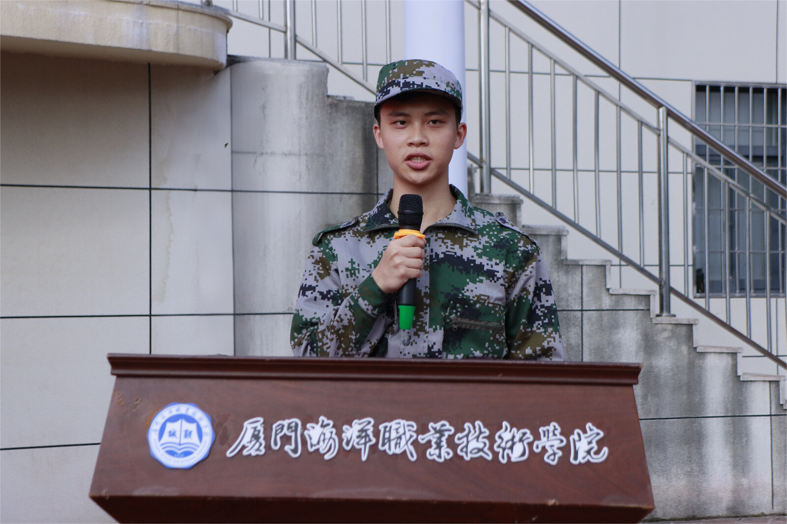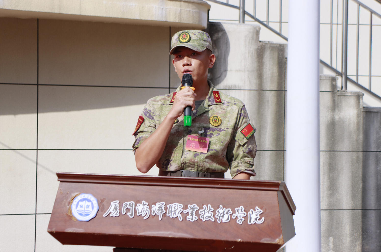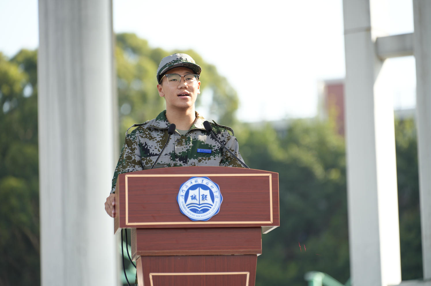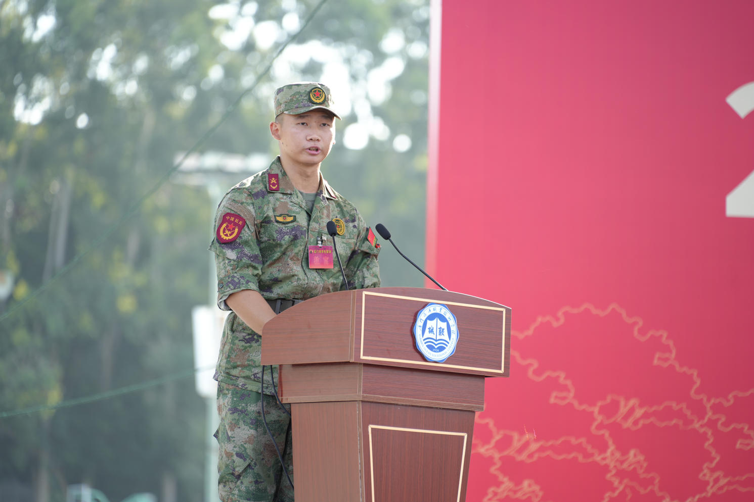 海洋文化与旅游学院夏鑫磊、航海学院廖豫作为参训学生代表发言,他们郑重承诺:将以“毅”为纲,磨砺意志,严守纪律,刻苦训练,团结协作,以昂扬斗志和优良作风展现海院学子担当,圆满完成军训任务。誓言响亮,彰显出新时代青年的坚定信念。