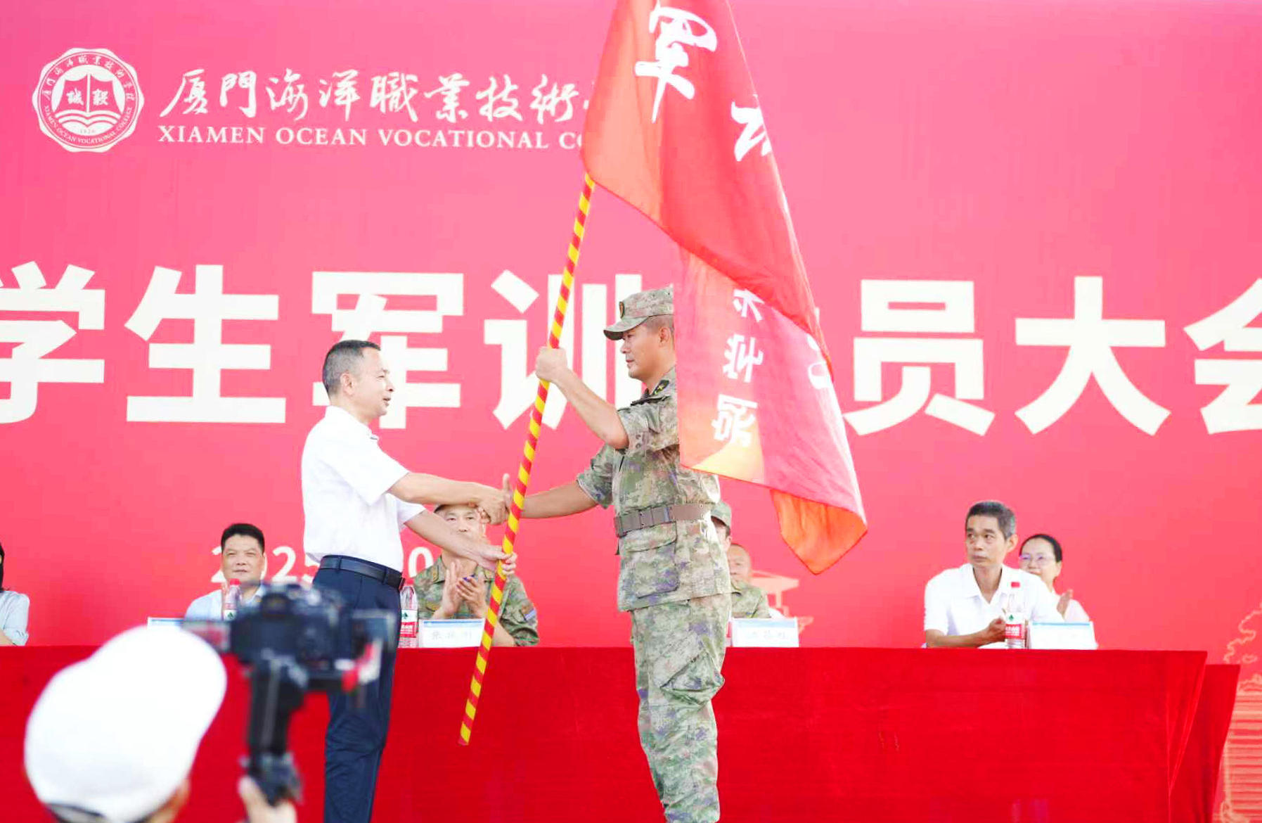 授旗仪式上,院长刘光明将“军训大队”队旗郑重授予军训总教官,标志着为期14天的军训任务正式启动。