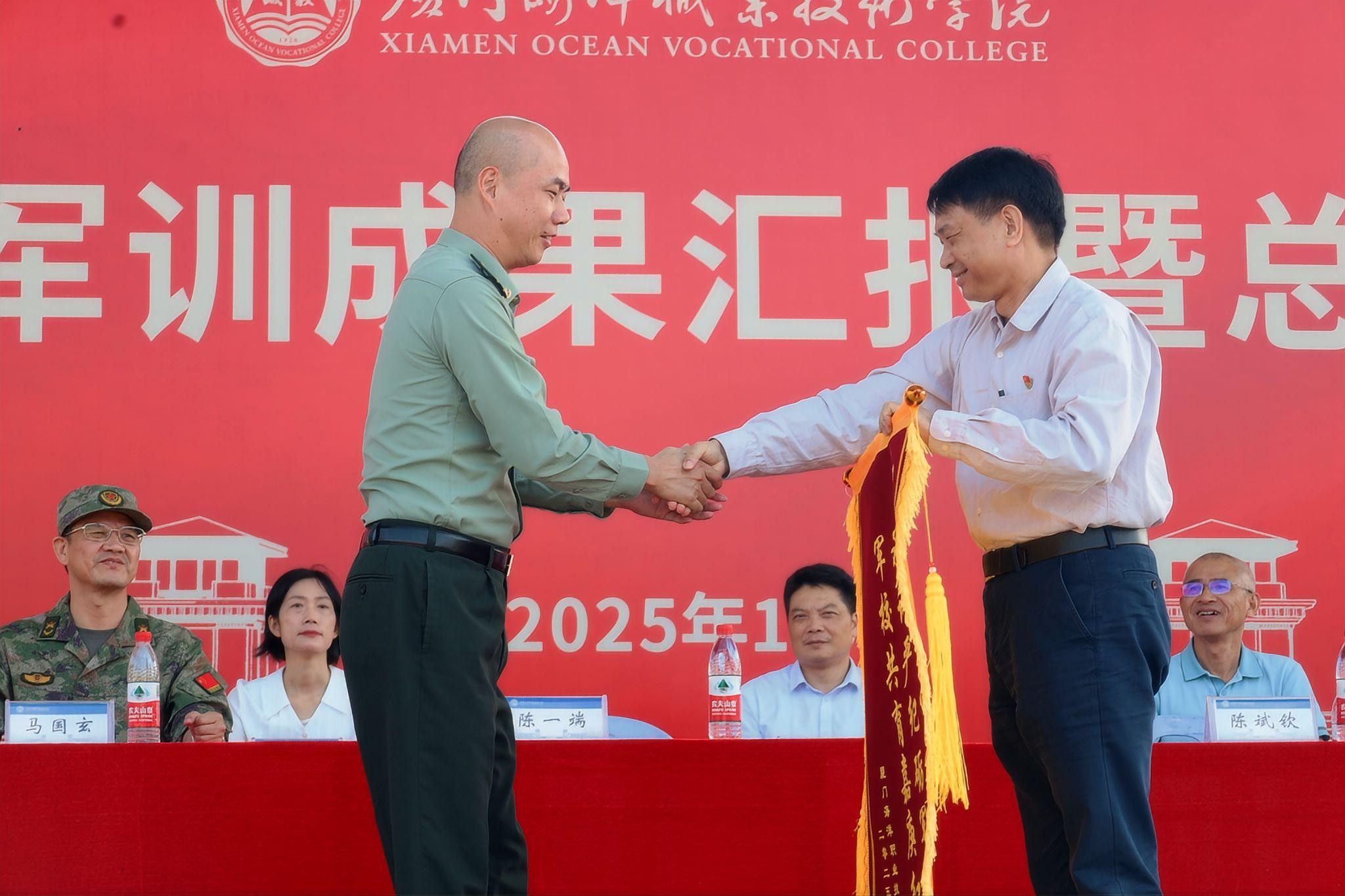 总结大会现场,陈一端代表学校向厦门警备区赠送锦旗。马国玄宣读2025级学生军训“先进集体”和“优秀个人”的表彰决定。授予物联网3251班等20个班级为军训“先进班级”、授予张垒等65位教官为军训“优秀教官”、授予戴钦凌等7位辅导员为军训“优秀指导员”、授予詹保盛等5位同学为军训“优秀助理教官”、授予电子3251班张荟琳等440名同学为军训“优秀学员”荣誉称号。