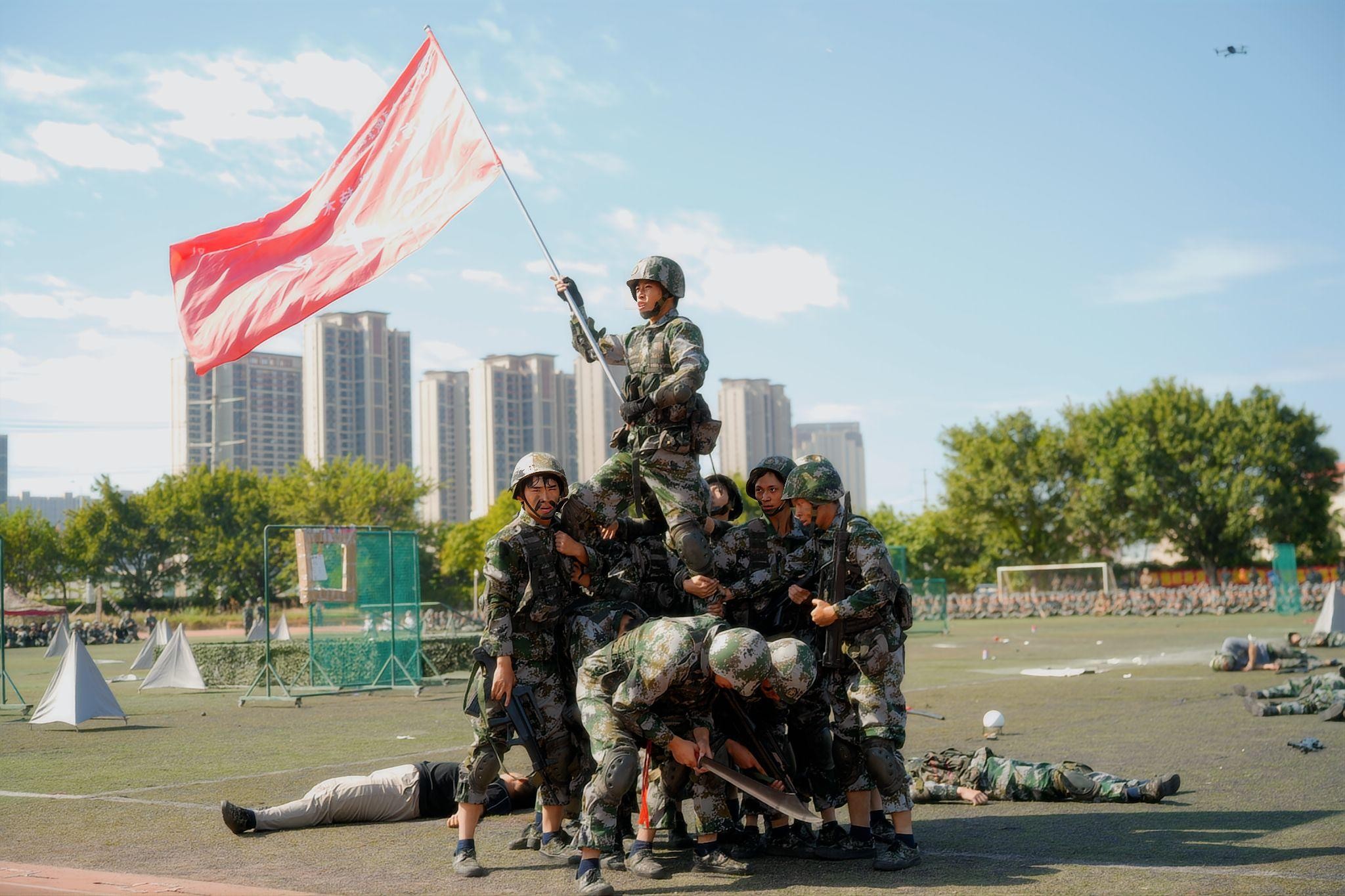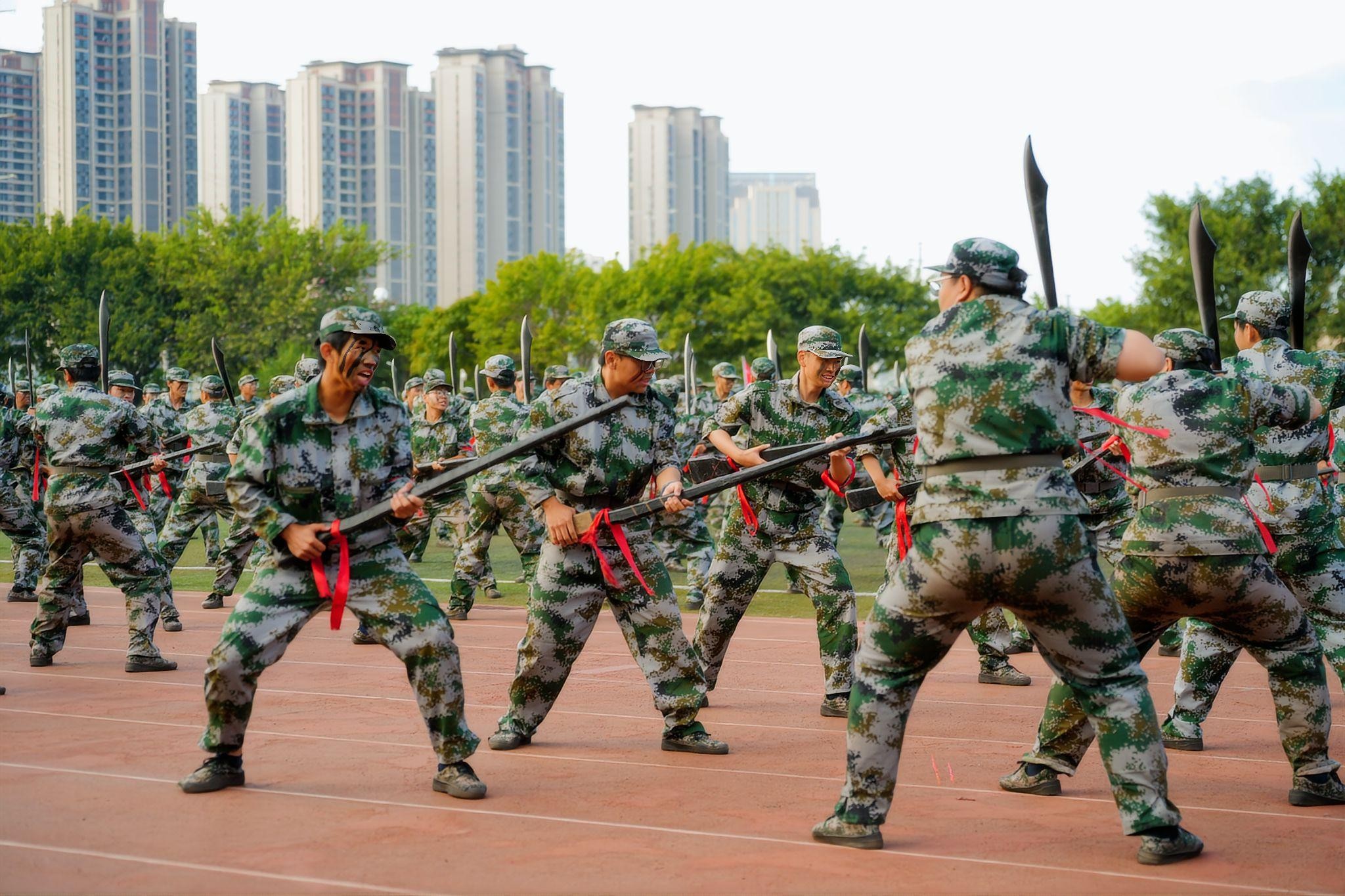 在教官的统一指挥下,来自各学院学生代表组成的特色表演方阵,分别进行了匕首操、军体拳、刺杀操、大刀队、格斗基础、战场医疗救护、综合战术等项目展示。